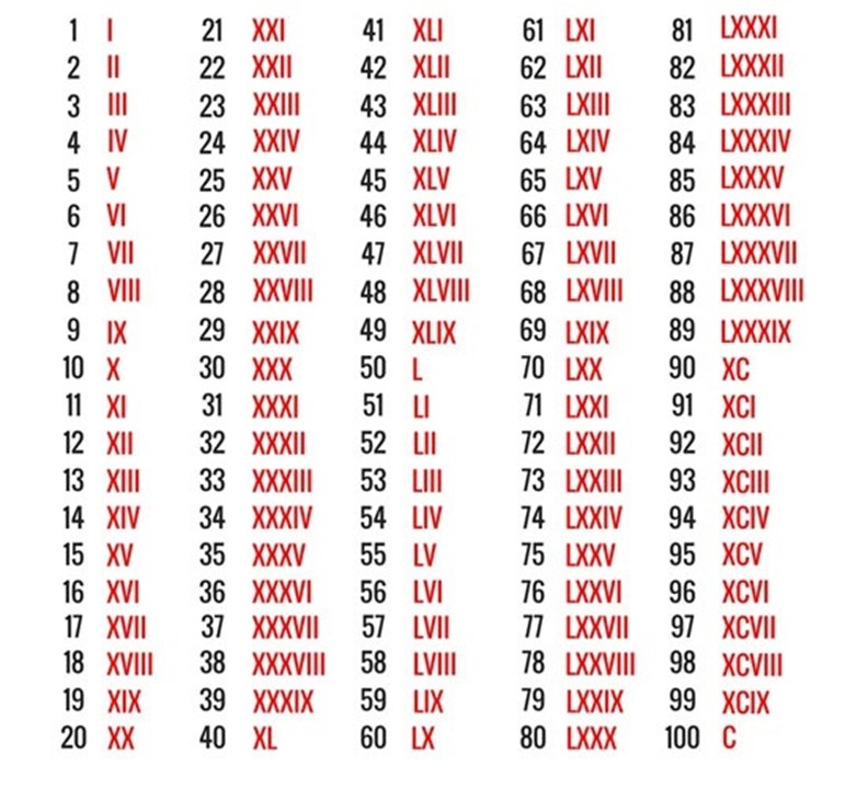 رومیها اعداد را با حروف نشان میدادند (مثل: X برای ۱۰ و V برای ۵). تصویر زیر اعداد رومی را از 1 تا 100 نشان میدهد فقط تصور کنید بخواهید با این روش یک ضرب ساده انجام دهید، چهقدر وقتگیر و گیجکننده میشود! مثلا بخواهیم بنویسیم: